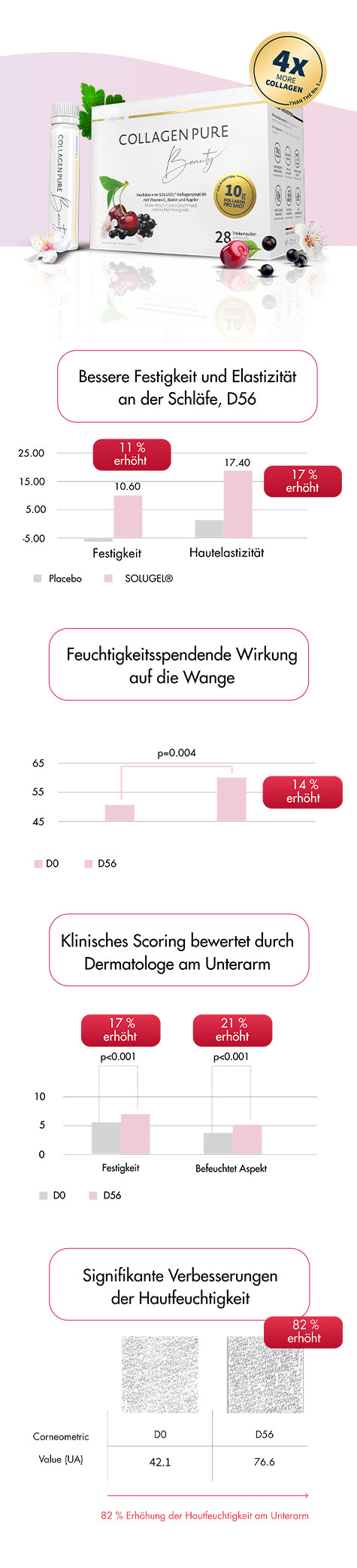 In einer klinischen Studie mit Frauen im Alter von 35-55 Jahren wurde die Wirkung des Kollagenpeptids SOLUGEL® auf die Haut untersucht. Die SOLUGEL®-Gruppe, die täglich 10 Gramm SOLUGEL® einnahm, erlebte nach nur 8 Wochen beeindruckende Ergebnisse: Eine signifikante Verbesserung der Festigkeit und Elastizität der Haut im Vergleich zur Placebogruppe wurde festgestellt. Zudem wurde eine Erhöhung der Hautfeuchtigkeit beobachtet.